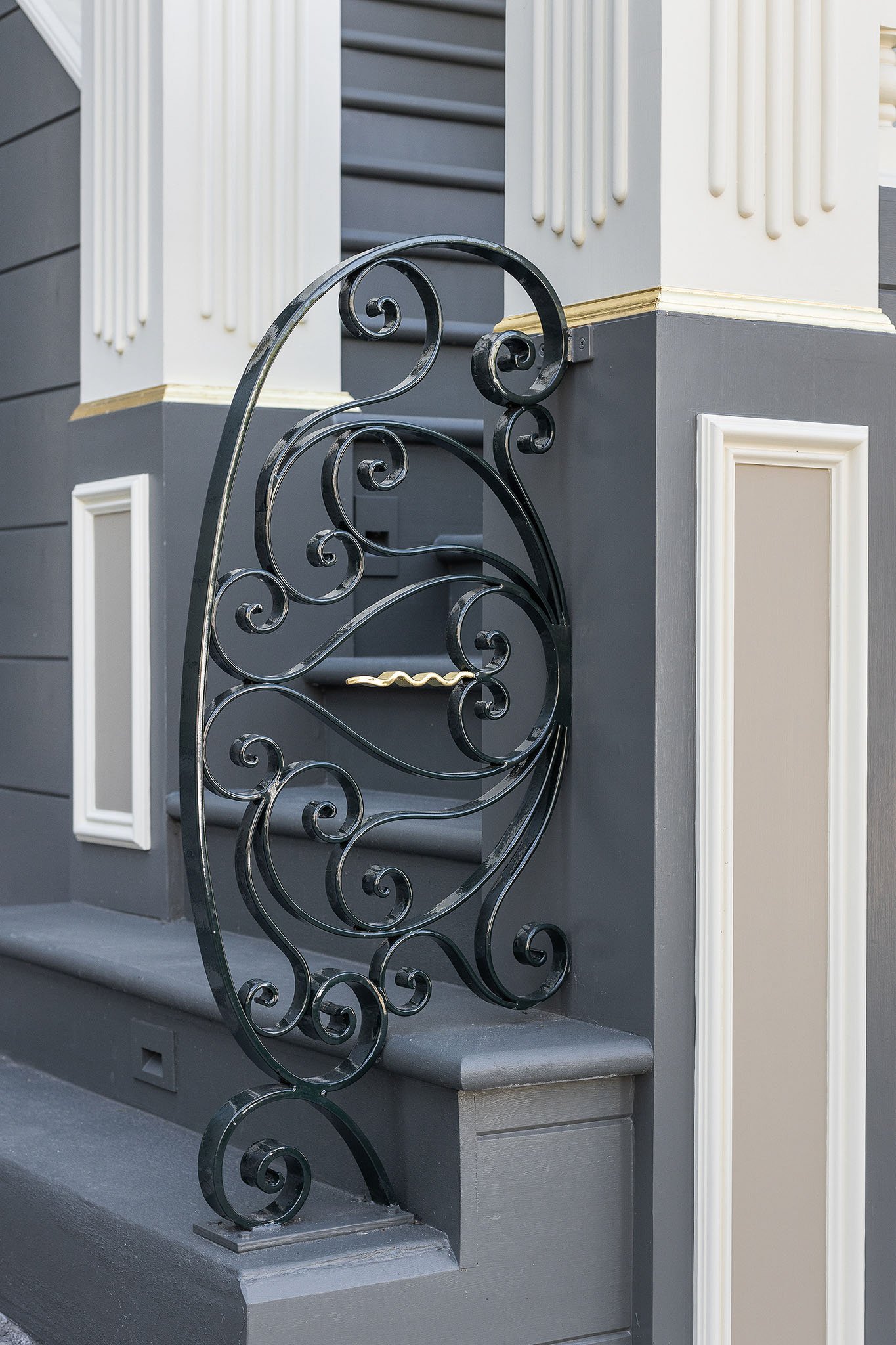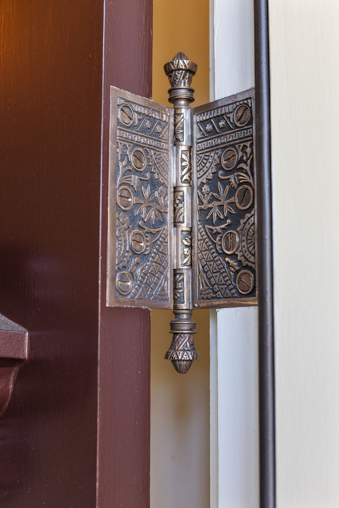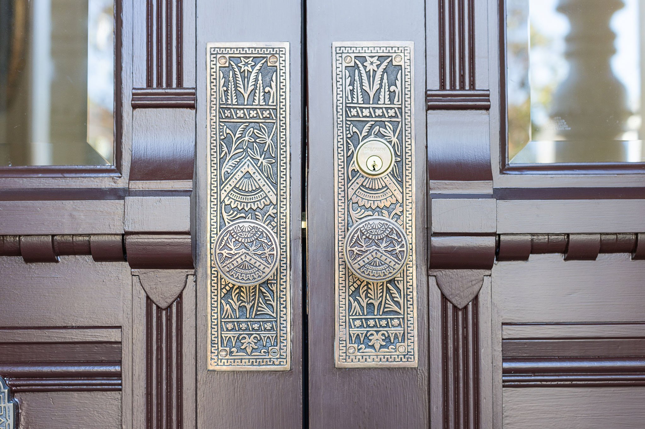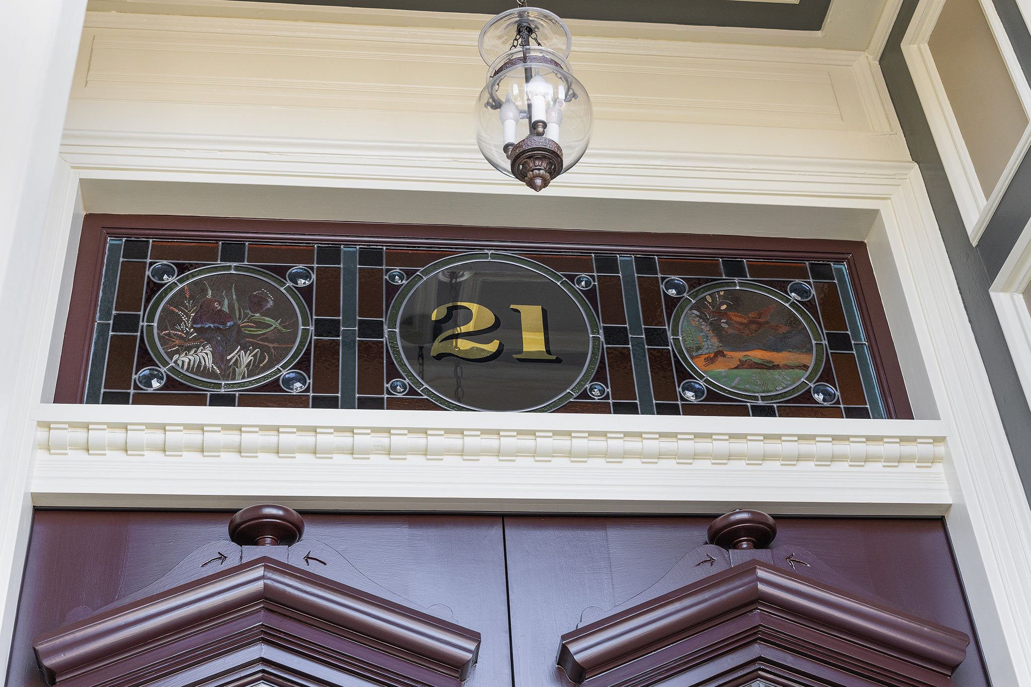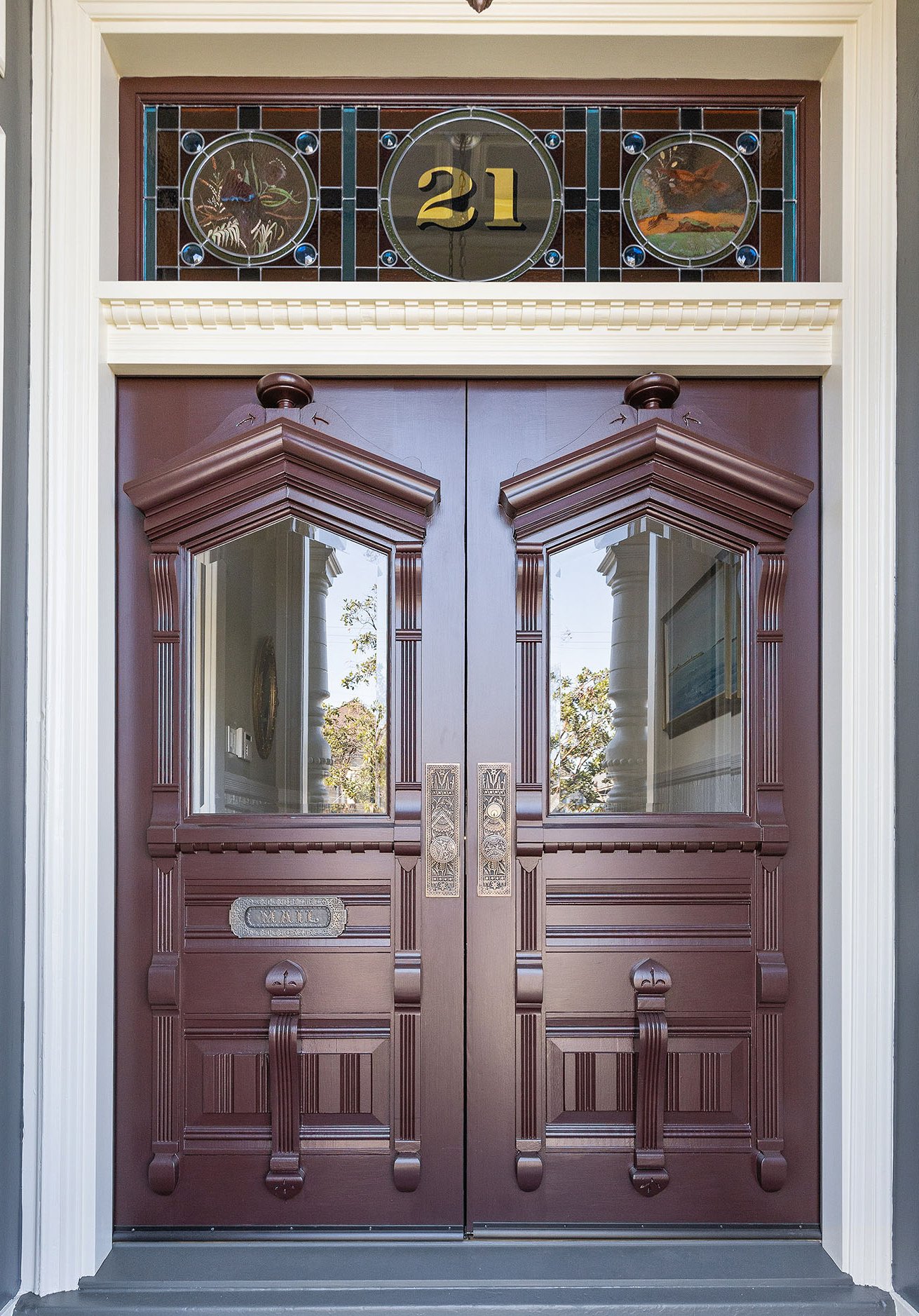 Through this journey, the staircase foundation was reengineered, the staircase designed and built, the original entry doors recreated, the stained glass transom created (including replication of the original hand-painted bird-theme rondels, many rotted decorated elements hand-carved, new and historic lighting installed, and a new iron handrail designed and fabricated.